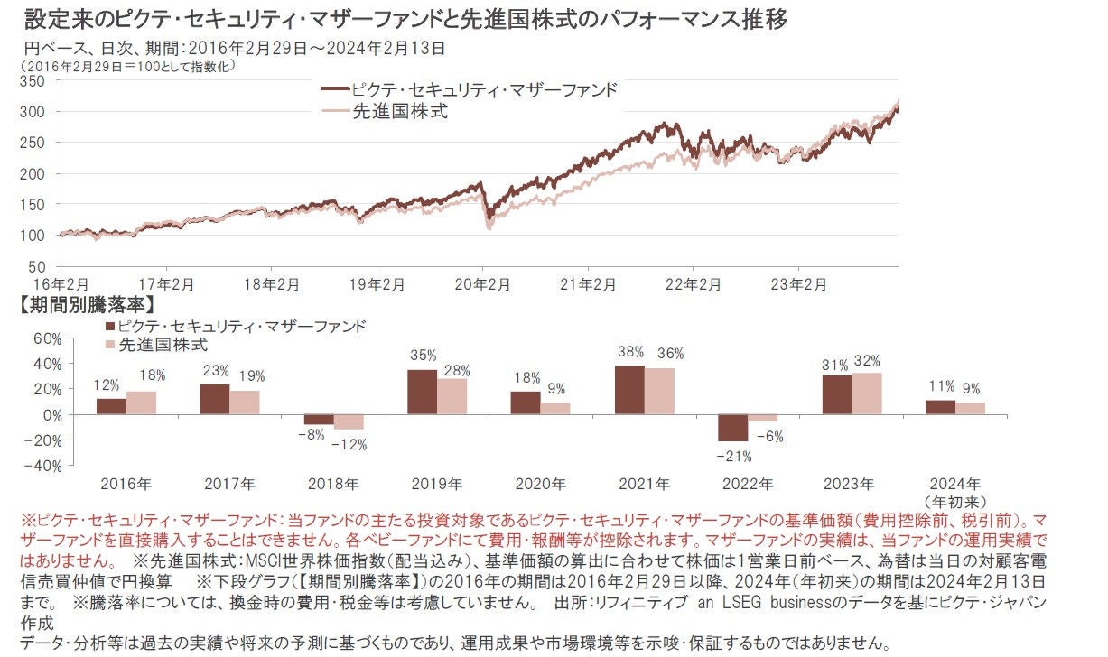 世界のセキュリティ関連企業の株式に投資を行う当ファンドのマザーファンドの基準価額は、2023年年間で+31%の上昇となりました。同期間における先進国株式(MSCI世界株価指数、円換算ベース、+32%)と同程度の上昇率となりました。また、2024年に入っても同様に上昇基調が続いています。