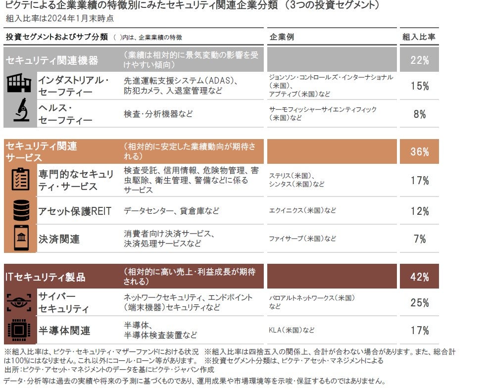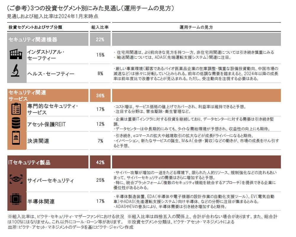 当ファンドにおける「3つの投資セグメント」注別に2023年年間のパフォーマンス動向をみると、景気変動の影響を受けやすい傾向がある自動車部品関連や、ライフサイエンス関連などを含む「セキュリティ関連機器」銘柄は、低調な株価推移となりました。一方、相対的に安定した業績動向が期待される「セキュリティ関連サービス」銘柄は、AI(人工知能)ブームなどを追い風としたデータセンター運営企業などを中心に、底堅い株価推移となりました。さらに、サイバーセキュリティや半導体関連企業を含む「ITセキュリティ製品」銘柄も、株価が上昇しました。こうした流れを受けて、2023年年間の当ファンドのマザーファンドのパフォーマンスは、「セキュリティ関連サービス」と「ITセキュリティ製品」のプラス寄与が、「セキュリティ関連機器」のマイナス寄与を相殺するかたちとなりました。 注:「ピクテによる企業業績の特徴別にみたセキュリティ関連企業分類 (3つの投資セグメント)」をご参照ください。