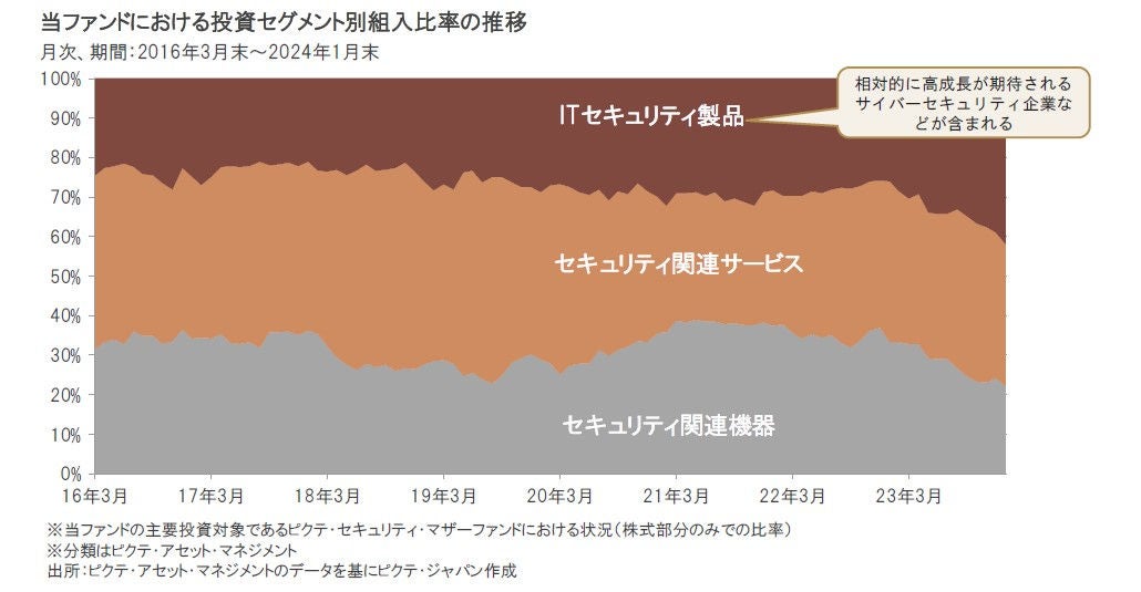 情報技術分野における新たな技術の登場が、中長期的な成長ドライバーとなるようなセキュリティ関連分野も多いと考えています。こうした分野は、短期的な景気減速によるマイナスの影響も小さく、中長期的にみて相対的に大きく成長することが期待できるとみられます。こうした見方から、足元では3つの投資セグメントのうち、「ITセキュリティ製品」の企業群に特に注目し、組入比率を相対的に高めています(「当ファンドにおける投資セグメント別組入比率の推移」をご参照ください)。