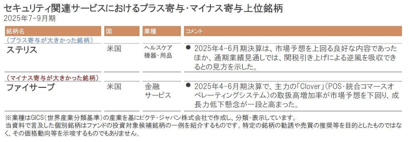 「セキュリティ関連サービス」のうち、プラス寄与が大きかった銘柄は、関税引き上げによるマイナスの影響に耐性を示したステリス(米国、ヘルスケア機器・用品)でした。一方、マイナス寄与が大きかったのは、前四半期に引き続き、ファイサーブ(米国、金融サービス)でした。ただし、当ファンドの運用チームは、ファイサーブについて、短期的には、投資家の悲観的な見方により株価はマイナスの影響を受け続ける可能性はある一方、2025年4-6月期決算で利益については、市場予想を上回ったほか、利益率も改善していることなどから、現時点ではファンダメンタルズ(基礎的条件)が大きく悪化しているわけではないとみています。