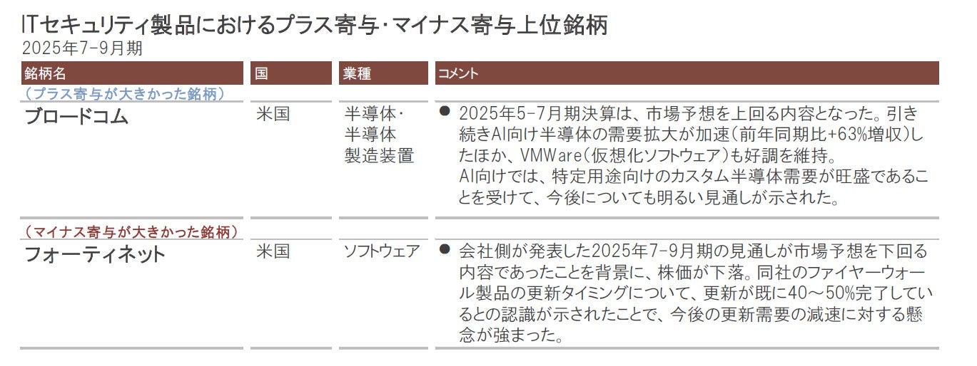 「ITセキュリティ製品」のうち、プラス寄与が大きかった企業は、前四半期(4-6月期)に続いて、AI関連需要の拡大で恩恵を受けるブロードコム(米国、半導体・半導体製造装置)でした。一方、マイナス寄与が大きかったのは、フォーティネット(米国、ソフトウェア)でした。
