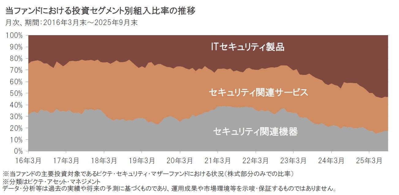 足元では特に、短期的な景気動向に左右されにくく、趨勢的な成長が期待できると考えられる、「ITセキュリティ製品」の組入比率を相対的に高位としています。