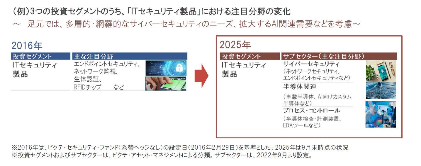 2025年7-9月期のピクテ・セキュリティ・ファンド(為替ヘッジあり)の基準価額は-1.1%、ピクテ・セキュリティ・ファンド(為替ヘッジなし)の基準価額は+2.8%となりました。一部のAI関連の企業や業績の回復の兆しを示した企業の株価上昇などが、プラス寄与となりました。