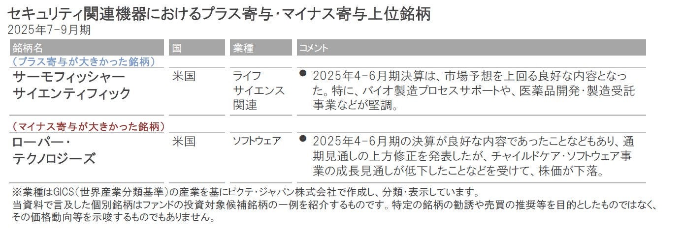 「セキュリティ関連機器」のうち、プラス寄与が大きかった銘柄は、2025年4-6月期決算で業績の回復が確認されたサーモフィッシャーサイエンティフィック(米国、ライフサイエンス関連)でした。一方、マイナス寄与が大きかった銘柄は、ローパー・テクノロジーズ(米国、ソフトウェア)でした。