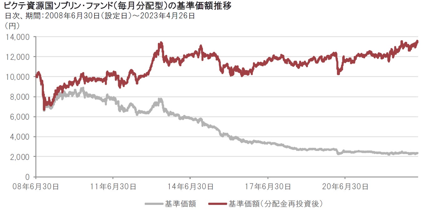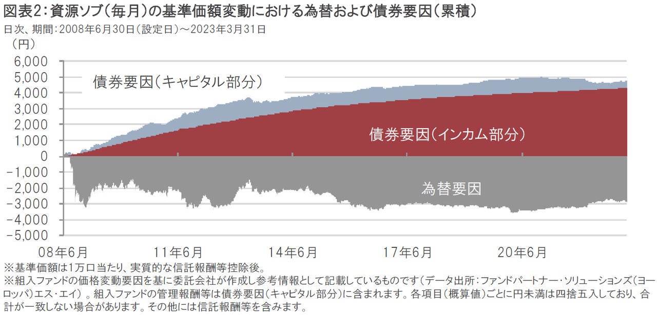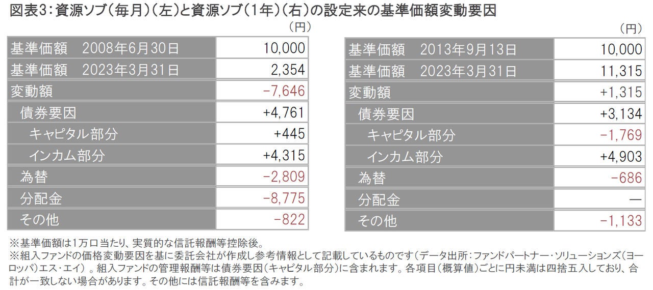 ピクテ資源国ソブリン・ファンド(毎月分配型)(以下、資源ソブ(毎月))の設定来の基準価額の変動を見ても、2023年3月31日時点では、為替要因が-2,809円のマイナス要因となっている一方で、債券要因のインカム部分が+4,315円、キャピタル(債券価格の変動)部分が+445円のプラス要因となっており、債券要因の中でもインカム部分の基準価額への寄与が大きくなっていることがわかります(図表2、図表3参照)。またピクテ資源国ソブリン・ファンド(1年決算型)(資源ソブ(1年))の設定来の基準価額の変動についても、債券要因のキャピタル部分はマイナスとなっていますが、インカム部分は資源ソブ(毎月)同様に基準価額へのプラス寄与が大きくなっていることがわかります(図表3参照)。