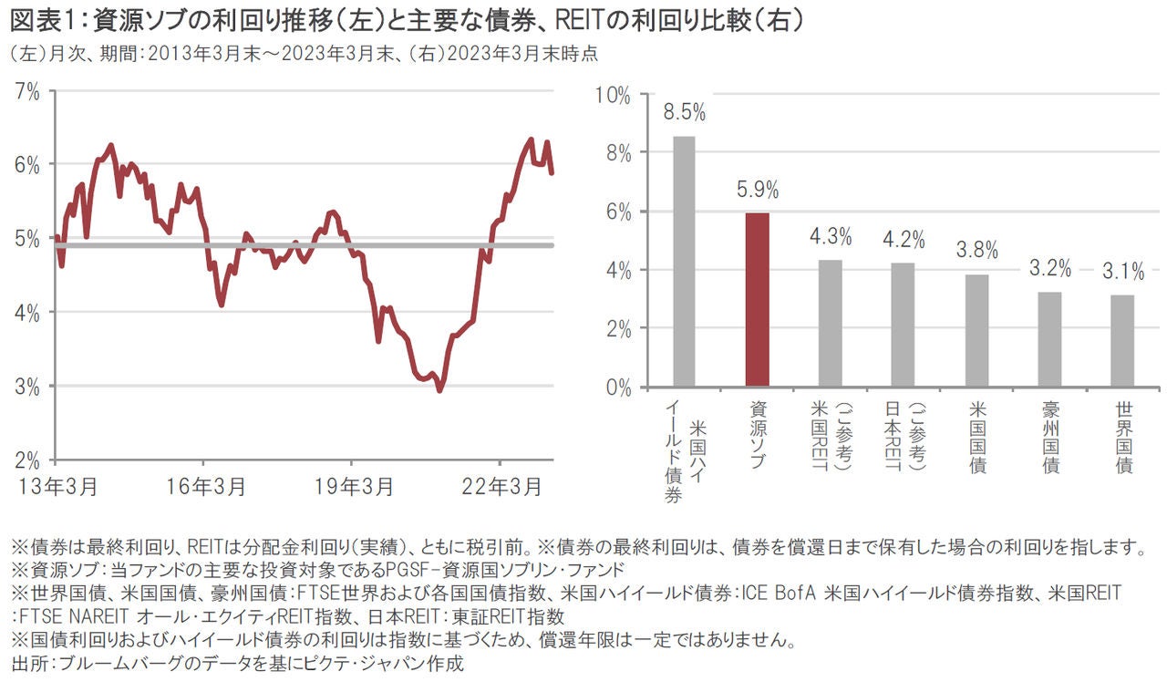 世界の資源国のソブリン債券等に分散投資するピクテ資源国ソブリン・ファンド(毎月分配型)/(1年決算型)(以下、資源ソブ)の最終利回りは、2023年3月末現在、5.9%注1となっており、過去10年で見ても高い水準にあります(図表1、左)。