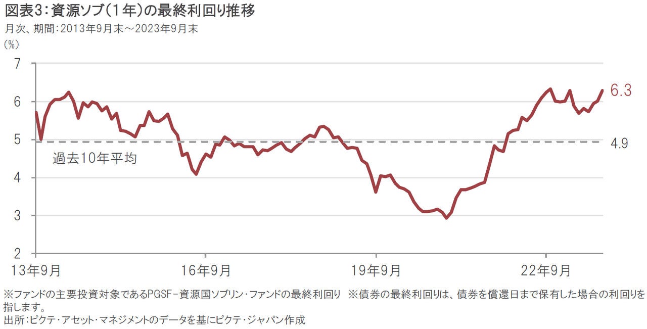 次に債券要因については、主要通貨に対して、先進国の国債利回りの上昇が影響し、債券のキャピタル部分は基準価額にとってマイナス寄与となった一方、資源ソブ(1年)の過去10年でみても高い水準にある利回り(2023年9月末時点で6.3%)から得られる利金収入によりインカム部分がプラス寄与となり、全体でもプラスとなりました(図表3参照)。