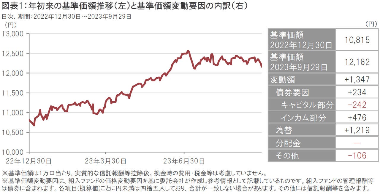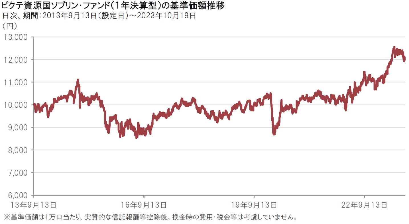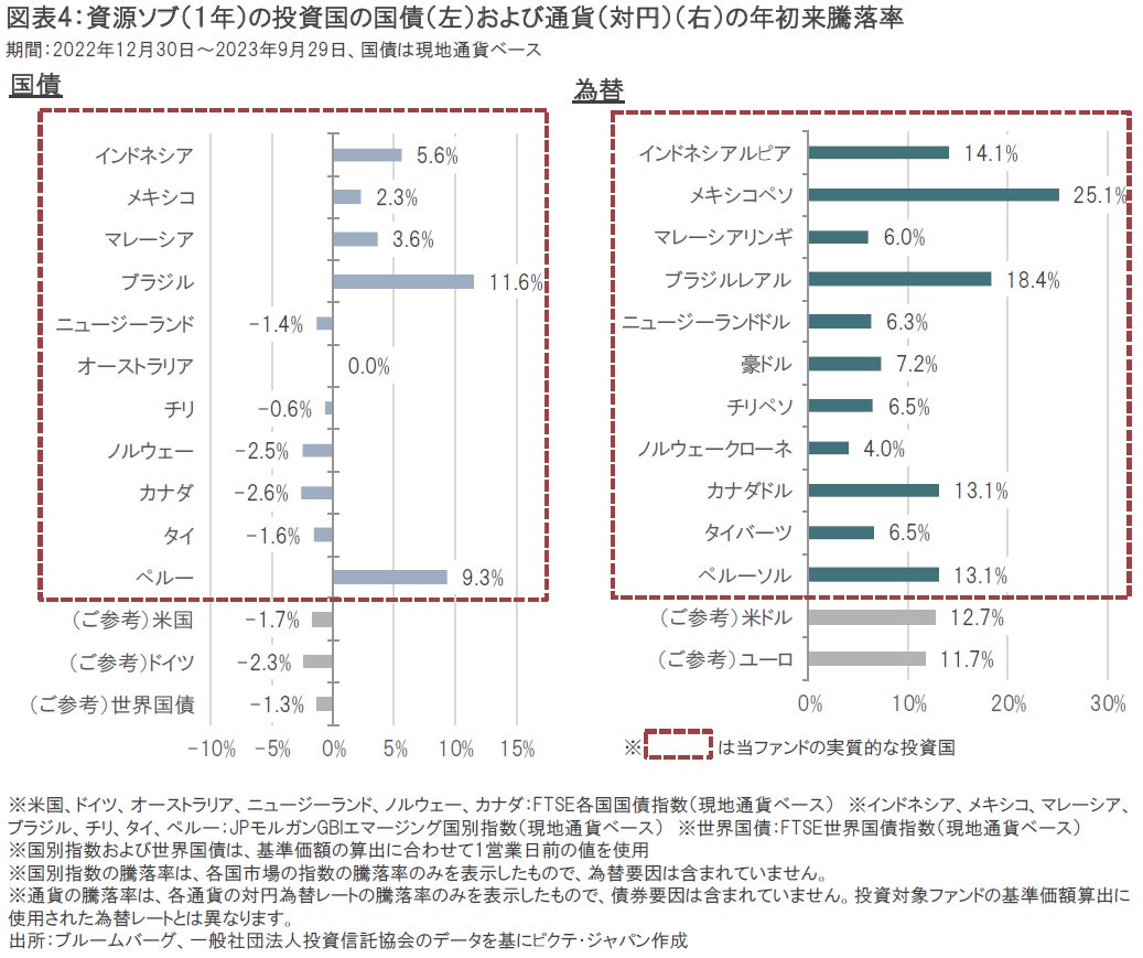 世界の資源国のソブリン債券等に分散投資するピクテ資源国ソブリン・ファンド(1年決算型)(以下、資源ソブ(1年))は、年初来で+12.5%の上昇となりました(2023年9月29日時点)(図表1参照)。
