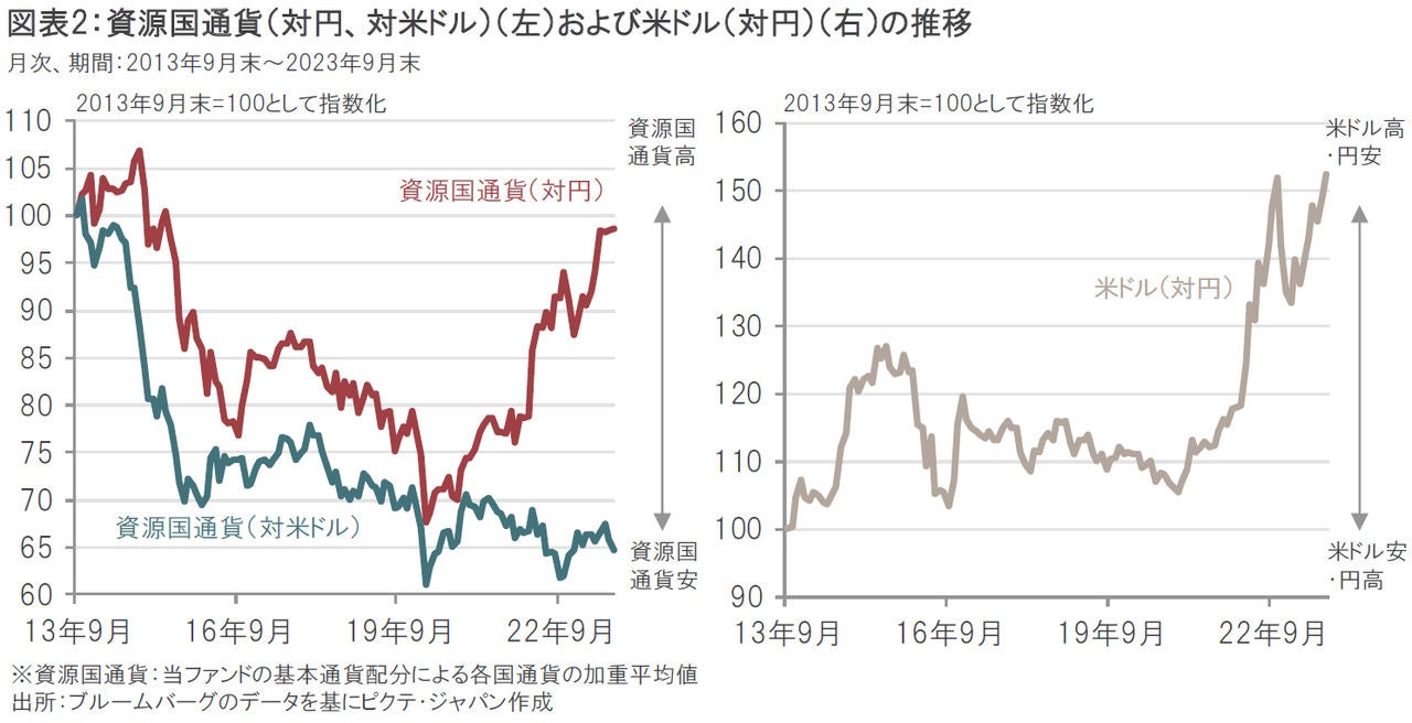 年初来(2023年9月29日時点)の基準価額変動要因の内訳をみると、まず為替要因が大きくプラス寄与となりました。日銀が引き続き緩和的な金融政策を継続する一方、世界の主要国はインフレ対応のため金融引き締めを実施し、今後も高水準で政策金利が維持されるとの見方などから世界の多くの通貨に対して円安となり、資源国通貨についても円に対して上昇しました(図表2参照)。