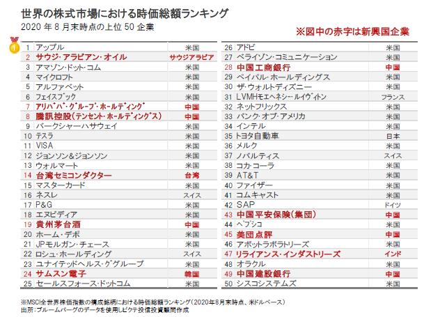 世界の時価総額ランキング上位50企業(2020年8月末時点)をみると、新興国企業では、サウジアラビアの国有石油会社であるサウジ・アラビアン・オイル(サウジアラムコ)が第2位となっています。また、中国では、これまでも上位にランクインしていた銀行セクターだけでなく、アリババ・グループ・ホールディングスをはじめとしたネット関連企業や高級酒の貴州茅台酒など消費関連企業などの台頭も著しく、上位50位に複数企業がランクインしています。また、台湾の台湾セミコンダクターや韓国のサムスン電子は高い技術力などを背景に、世界の様々なテクノロジー機器を支える欠かせない存在となっています。