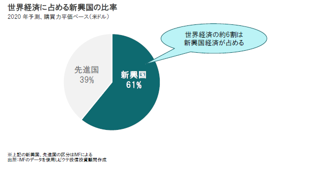 新興国には豊富な人口(労働・消費の担い手)が存在し、また国によっては各国の特性を生かして、技術力を高めることなどにより、高い付加価値を生み出せる経済構造となっている国、また、さらなる成長に向けて成長の阻害要因を取り除くための構造改革等を進める国も多くあり、今後も中長期的に先進国を上回る成長が期待できるとみられます。世界経済に占める新興国の比率は、さらに拡大する可能性も高いと考えられます。