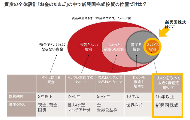 資産設計を考える中で、新興国株式に投資をする場合には「スパイス」的な投資と位置づけられるでしょう。資産全体のバランスを考え、長期的(例えば、15年以上)な投資が可能な一部の余剰資金を投資するというイメージです。