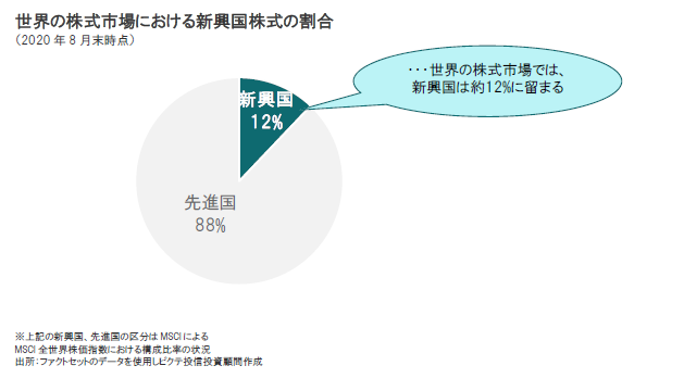 代表的な世界全体の株価指数であるMSCI全世界株価指数の構成比率(MSCIによる区分)をみると、2020年8月末時点で、先進国が約88%(うち、米国が約59%)に対して新興国は約12%に留まります。