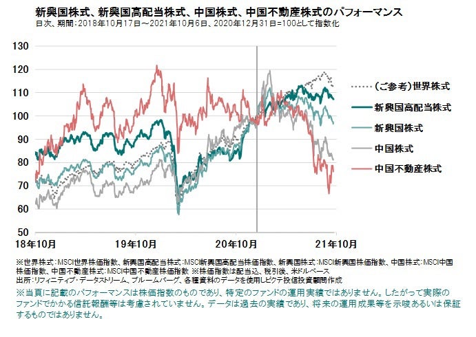 金融市場では、中国の大手不動産企業が債務不履行(デフォルト)となればその影響が中国の株式や社債などに留まらず、世界の金融資産に波及する可能性があるのではないかとの懸念が強まりました。中国や香港市場で関連株式や社債などが大きく下落するなか、当ファンドの投資対象である新興国高配当株式は分散しており、下落率は相対的に小さくなっています。中国および新興国の中・長期の成長の当社見通しに大きな変更はありません。