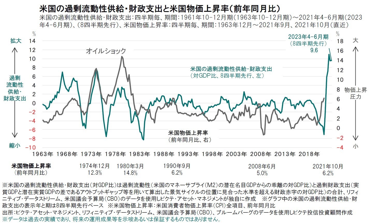 これまで景気下支えのため世界の主要国・地域の中央銀行が行ってきた流動性供給や主要国の財政支出などは過去最高水準となっています。米国の過剰流動性供給・財政支出の水準は、物価上昇圧力が高まった1970年代のオイルショック時の水準を大きく上回っており、物価上昇圧力となると考えられます。