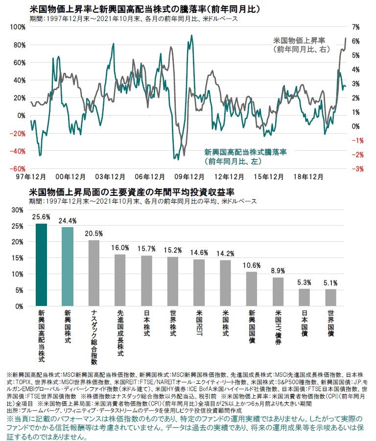 コロナショックを経て、経済の正常化の動きが進むなか、米国など多くの国で物価が上昇しています。2021年10月の米国の物価上昇率は前年同月比+6.2%となり、31年ぶりの高水準となりました。過去の実績では、物価上昇局面では新興国高配当株式のパフォーマンスは他の主要資産を上回りました。今後の新興国高配当株式の動向に注目です。