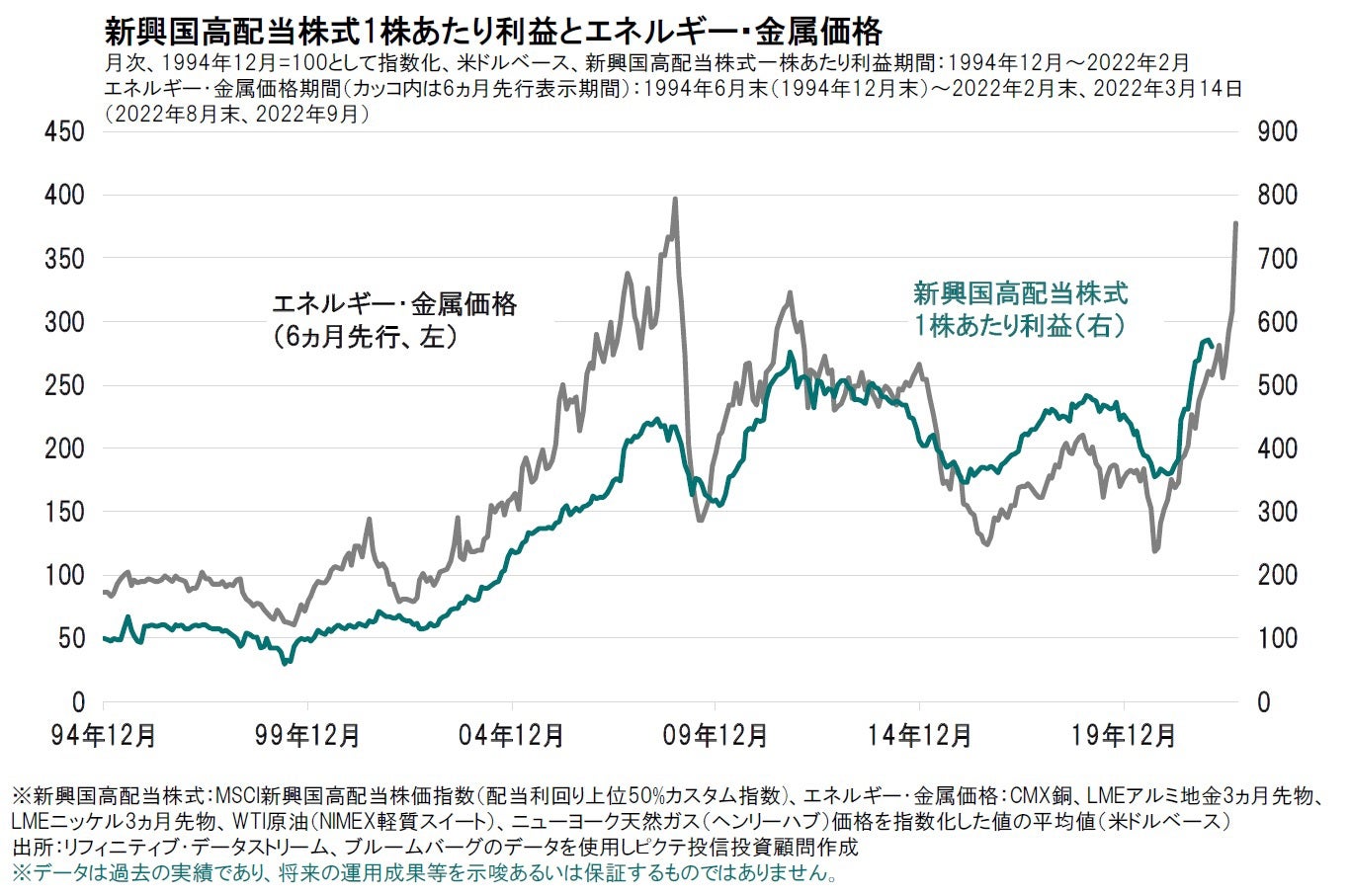 このため、新興国高配当株式は新興国株式平均よりも相対的にエネルギー・金属価格の影響を受け易くなっています。実際に、過去の実績(1994年12月末~2022年2月末)でみると、新興国高配当株式の1株当たり利益は、エネルギー・金属価格との連動性が高く、エネルギー・金属価格が6ヵ月ほど先行する傾向がみられました。