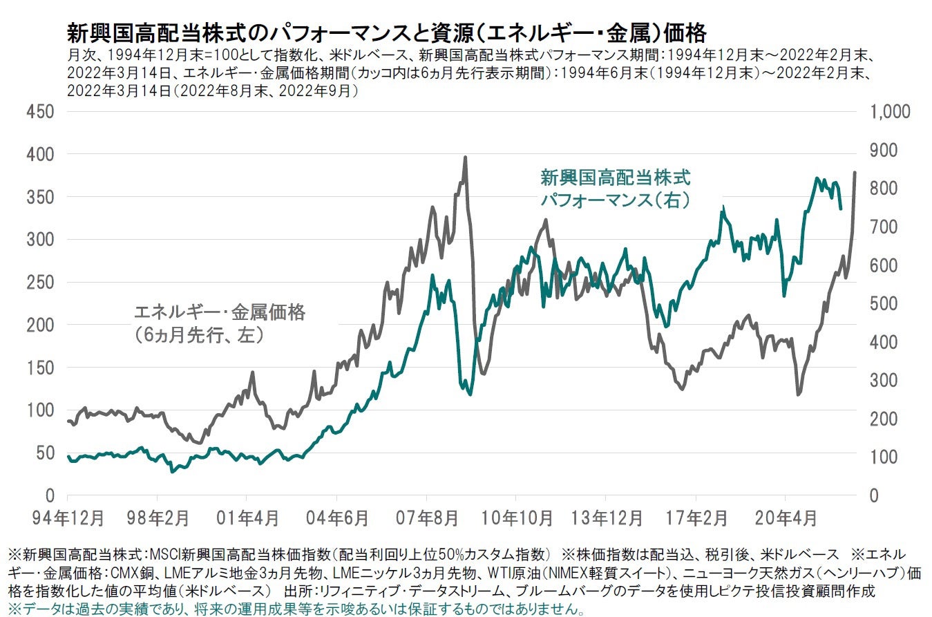 ●コロナショックを経て、経済の正常化が進み資源価格が上昇するなか、ロシアのウクライナ侵攻がその上昇に拍車。●過去の実績では、新興国高配当株式のパフォーマンスは資源価格と連動性が高い。
