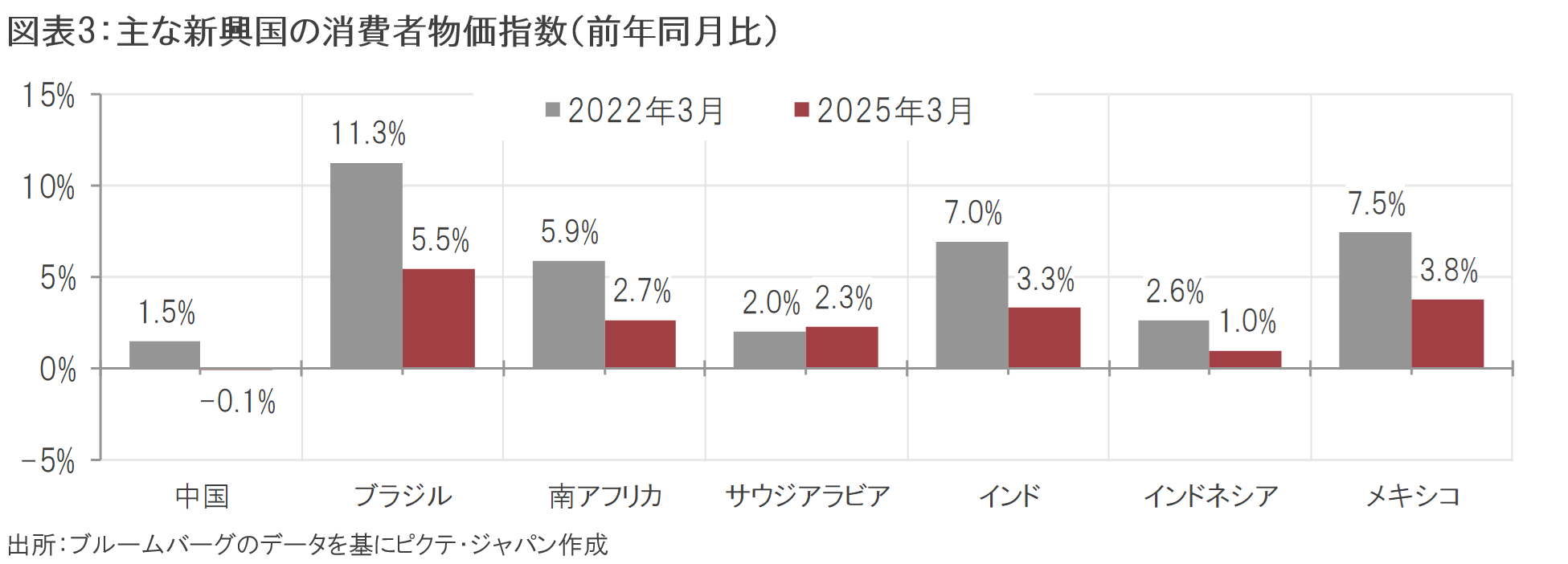 新興国の多くではインフレ圧力が低下傾向にあることから、中央銀行には利下げを実施する余力があると考えられます。米国の相互関税などによる新興国経済に対するマイナスの影響が懸念される中で、利下げの実施による景気支援が期待されることは、株式市場の下支え材料になると考えられます。ただし、利下げが自国通貨安(米ドル高)に繋がる可能性があることから、国・地域毎の状況に応じた投資を行うことが重要です。