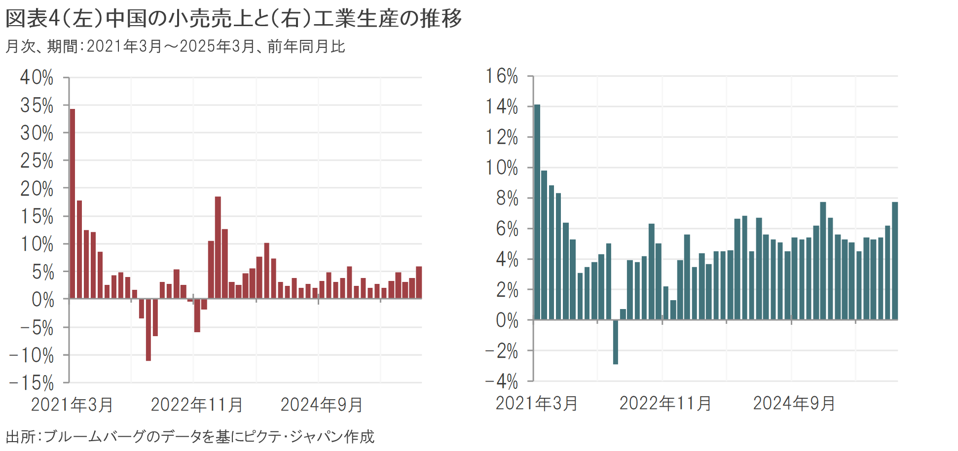 中国経済は、製造業を中心として米中貿易摩擦の影響が懸念されるものの、政府による財政・金融政策が景気を下支えする効果がその影響を軽減することが想定されます。2024年には、住宅ローンの緩和や家電購入の促進策などに加え、金融緩和などからなる経済対策が打ち出されましたが、足元では消費や工業生産が内需の底堅さを示しており、景気の回復傾向が強まっているとみられます。