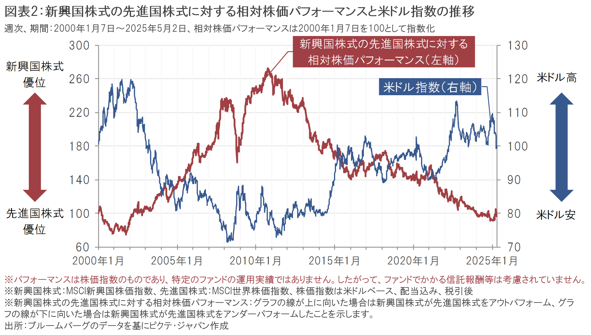 米ドル指数注1は、2025年年初来で、主要通貨に対して下落基調となりました(図表1参照)。米国の強硬な外交政策に対する不信感などを背景として、投資家が米ドル建て資産への投資を敬遠する動きが強まったことなどが要因として考えられます。今後についても、相互関税の影響などによる米国の景気見通しの悪化に加え、債務の拡大を背景とする米ドルへの信認の低下などから、米ドル安の傾向が続く可能性があります。米ドル安(新興国通貨高)となった場合、新興国政府の対外債務や企業の米ドル建て資金の調達コストの軽減を通じて財政や信用力の改善に繋がると考えられ、新興国の株式市場に資金が流入する要因になると考えられます。