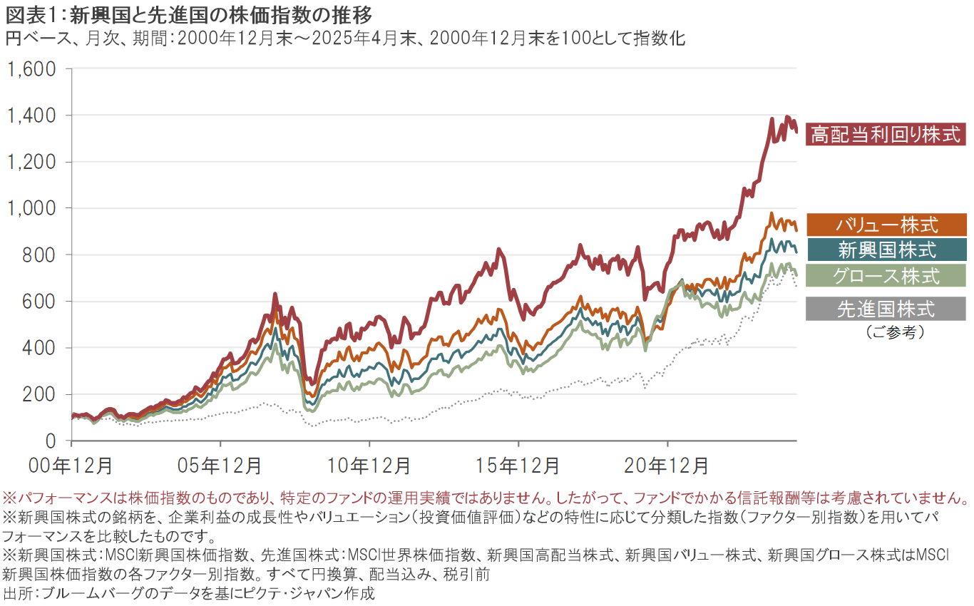 新興国株式は、2000年以降の長期の実績において先進国株式を上回る水準で推移してきました。また、新興国株式の中でも、配当利回りが高く、継続的な配当の支払い実績に着目した銘柄群(高配当利回り株式)や、割安なバリュエーションに着目した銘柄群(バリュー株式)が、新興国株式市場全体(新興国株式)のリターンを上回りました(図表1)。