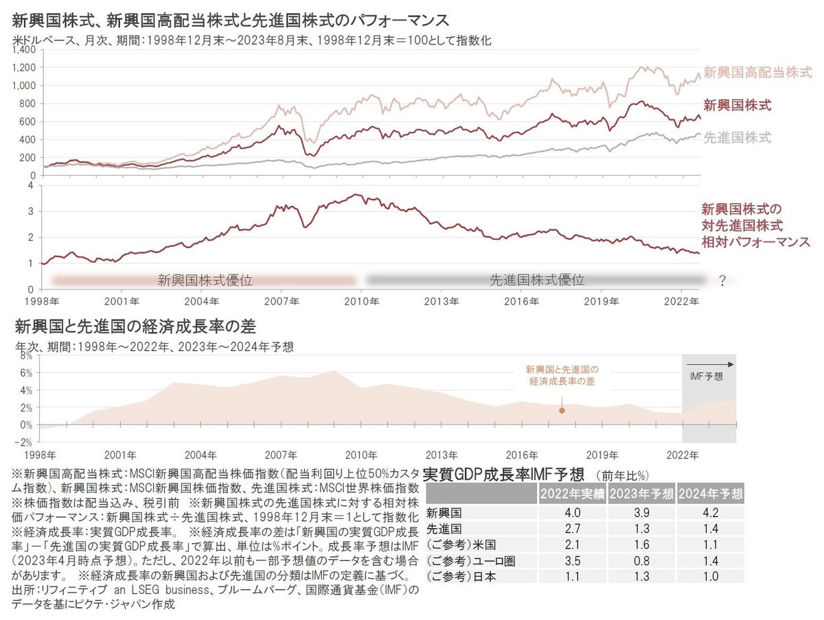 過去20年超のトレンドを見ると、新興国と先進国の経済成長率の差が拡大している局面では、新興国株式の相対的なパフォーマンスの改善がみられました。国際通貨基金(IMF)予想では、2023年~2024年にかけては、新興国は先進国を上回る経済成長が予想されています。過去の実績では、当ファンドの投資対象である新興国高配当株式は、新興国株式を長期的にアウトパフォームしました。