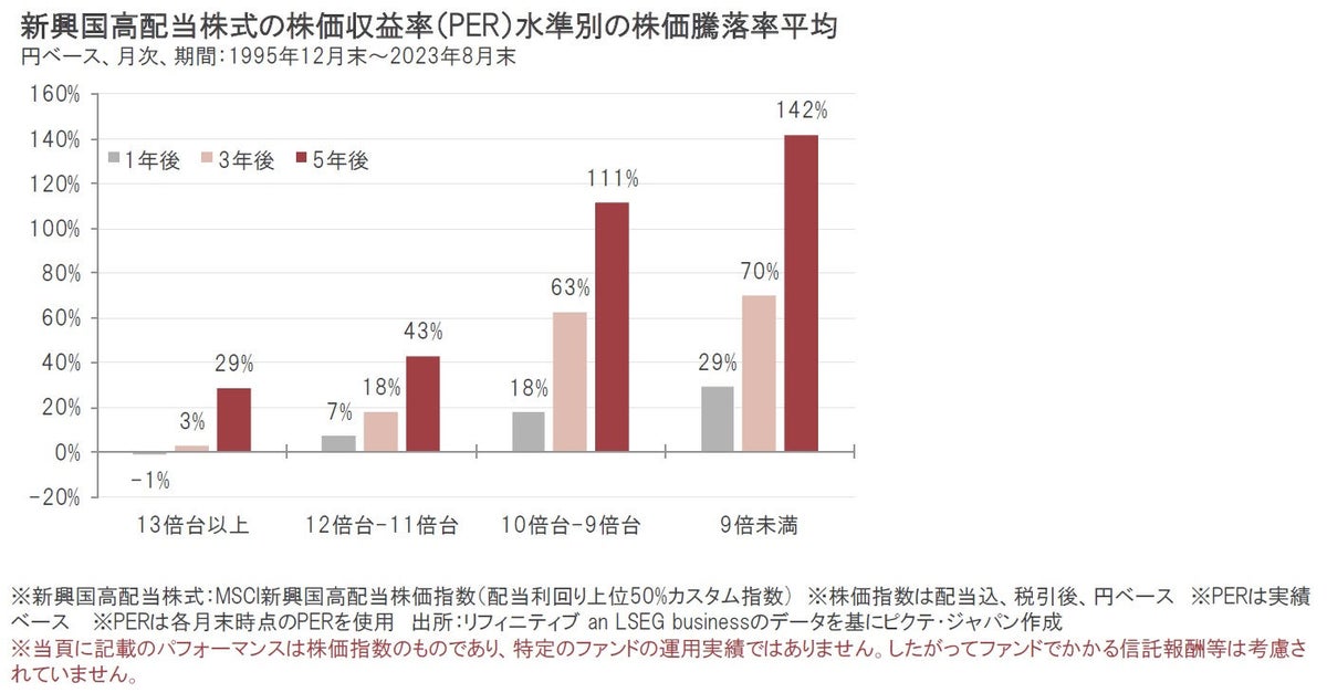 新興国高配当株式のPERの水準別にその後の株価騰落率をみると、過去の実績ではPERの水準が低いほど、その後の株価上昇率が高くなっています。2023年8月末の新興国高配当株式のPERは9.2倍です。過去の実績(1995年12月末~2023年8月末)で10倍台~9倍台をつけたときには、株価は1年後の平均で18%、3年後で同63%、5年後で同111%上昇しています。