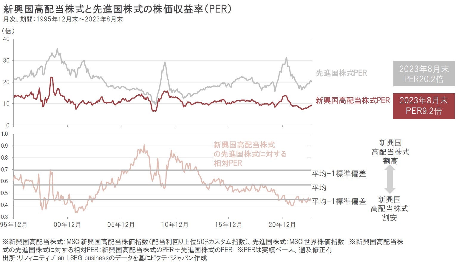 ■ 新興国高配当株式のPERは対先進国株式でみても過去平均を大きく下回る