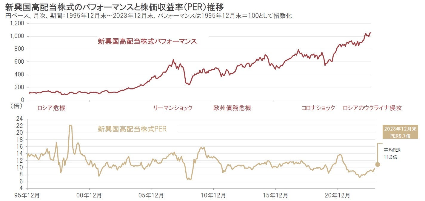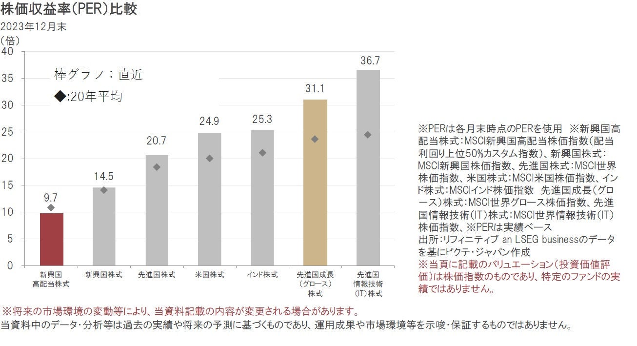 新興国高配当株式のPERは9.7倍(2023年12月末)と、他の株式と比べて低い水準です。