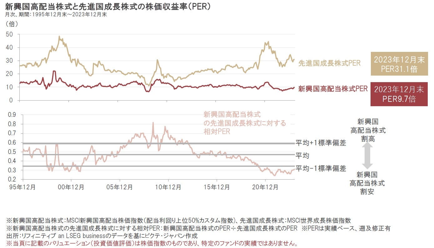 新興国高配当株式のPERは先進国成長株式に対する相対PERでは過去平均を大きく下回っています。