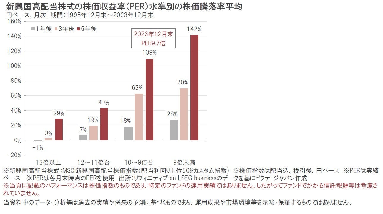 新興国高配当株式のPERの水準別にその後の株価騰落率をみると、過去の実績ではPERの水準が低いほど、その後の株価上昇率が高くなっています。2023年12月末の新興国高配当株式のPERは9.7倍です。過去の実績(1995年12月末~2023年12月末)でPERが10倍台~9倍台をつけたときには、株価は1年後の平均で18%、3年後で同63%、5年後で同109%上昇しています