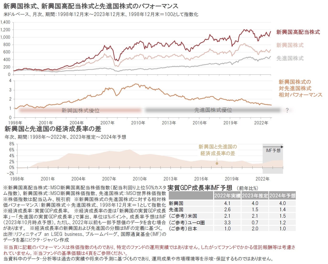 過去20年超のトレンドを見ると、新興国と先進国の経済成長率の差が拡大している局面では、新興国株式の先進国株式に対する相対的なパフォーマンスの改善がみられました。国際通貨基金(IMF)予想では、2024年には、新興国と先進国の経済成長率の差が拡大することが予想されています。