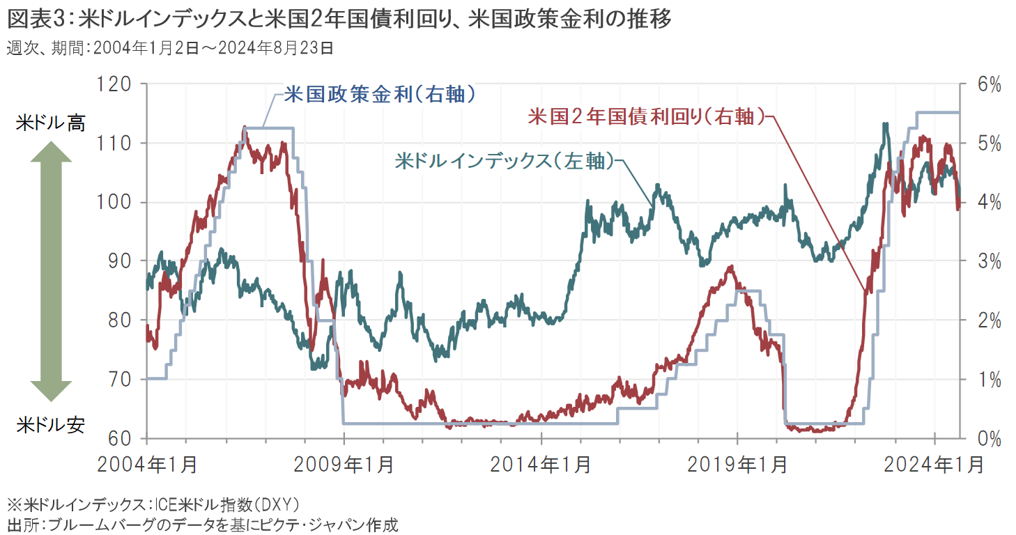 新興国株式の先進国株式に対する相対パフォーマンスと米ドルインデックスとの関係では、米ドルが主要通貨に対して低下する局面において、新興国株式のパフォーマンスが先進国株式よりも有利となる傾向があることが示唆されています(図表2、米ドルインデックスは逆目盛で表記しています)。