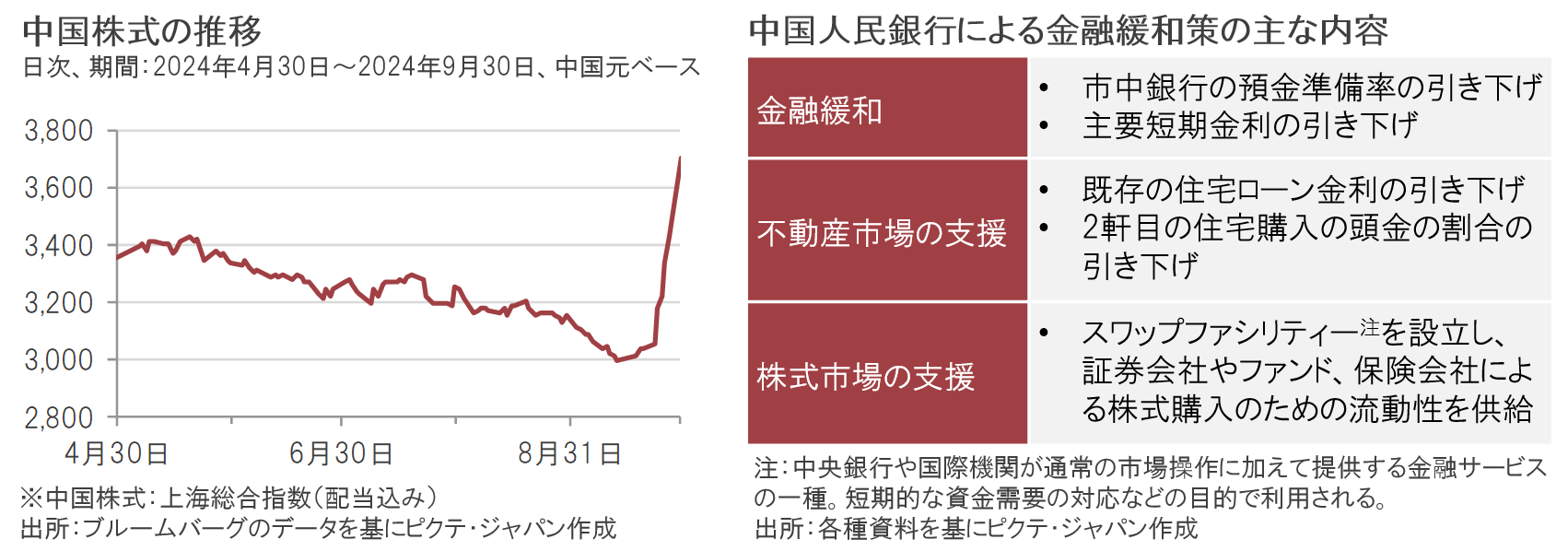 中国では、不動産市場や消費の低迷などを背景とする景気減速懸念から、株式市場が低調に推移していましたが、9月中旬以降、当局が金融緩和に加え積極的な財政政策を推進し、景気刺激策を強化する方針を打ち出したことを受けて、大きく反発しました。