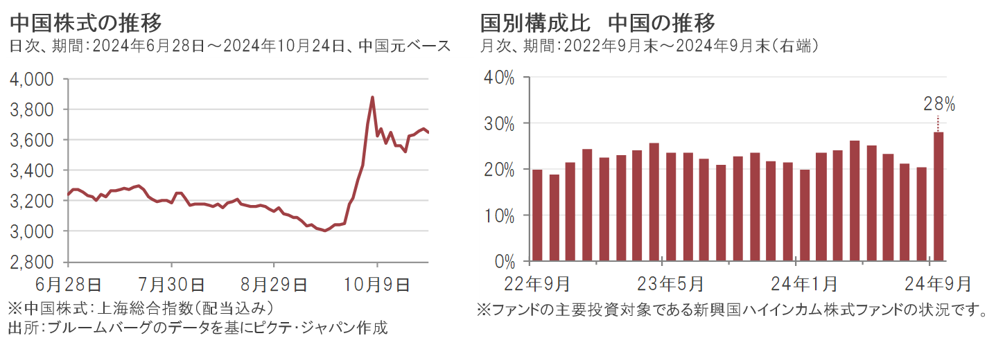 中国では、9月中旬以降、当局が主要な政策金利の引き下げなどの金融緩和や積極的な財政支出を実施する方針を打ち出し、景気を下支えする姿勢を示したことを受けて、株価が大きく上昇しました。その後、10月上旬の国家発展改革委員会の記者会見で追加の景気刺激策の詳細が示されなかったことから株価は下落に転じましたが、この市場の動きは当局の景気刺激策に対する過度な期待の後退を反映したものであると考えています。
