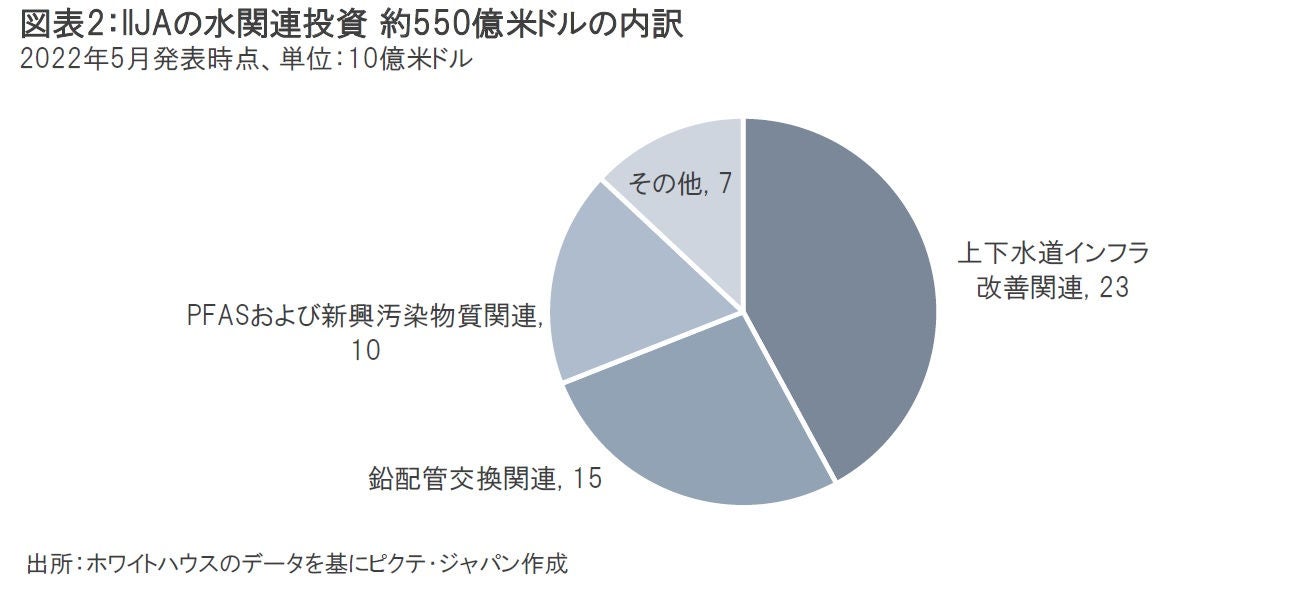 新たに支出される約5,500億米ドルのうち、水関連は約550億米ドルで、これには上下水道インフラ改善のための投資に加え、鉛配管の交換やPFAS*などの新興汚染物質に対処するための投資も含まれます(図表2)。