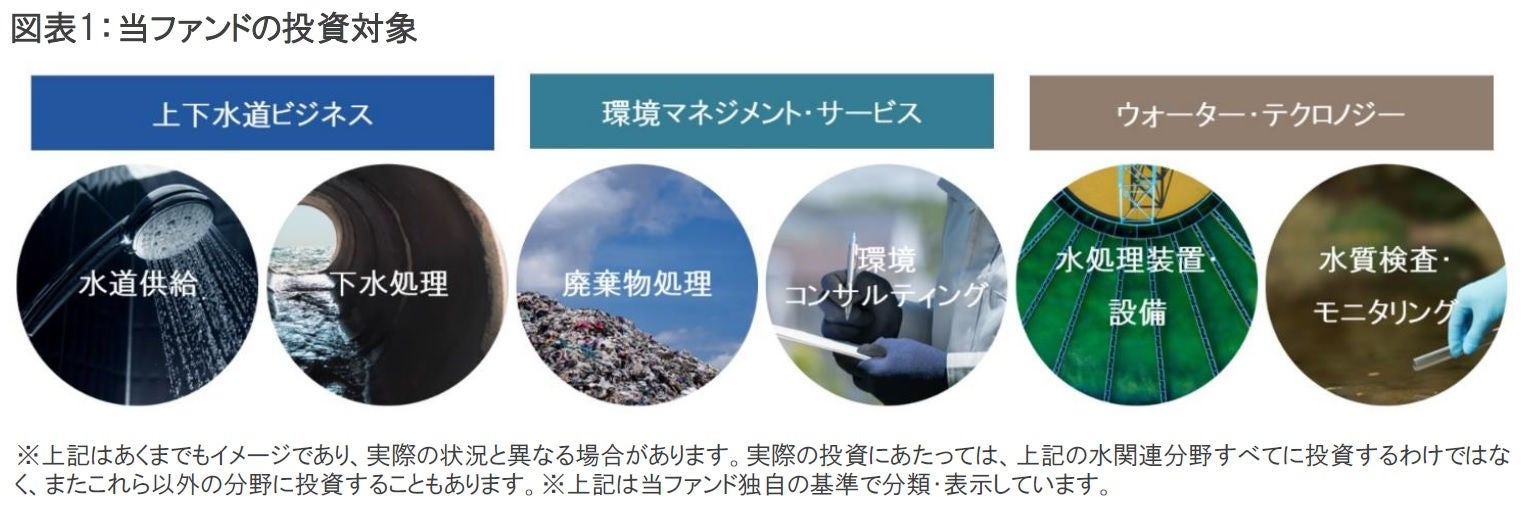 当ファンドは、主に世界の水関連企業の株式に投資します。当ファンドにおける水関連企業とは、①上下水道ビジネス、②環境マネジメント・サービス(貴重な資源である地下水の汚染を来さないための適切な埋立地管理等を行う廃棄物処理や、インフラの構築・運営に携わる環境コンサルティングなど)、③ウォーター・テクノロジー(上下水道インフラで使用される設備のほか、食品や半導体などの製造に用いられる純度の高い水を作るための装置・サービスの提供など)分野の企業をいいます(図表1)。