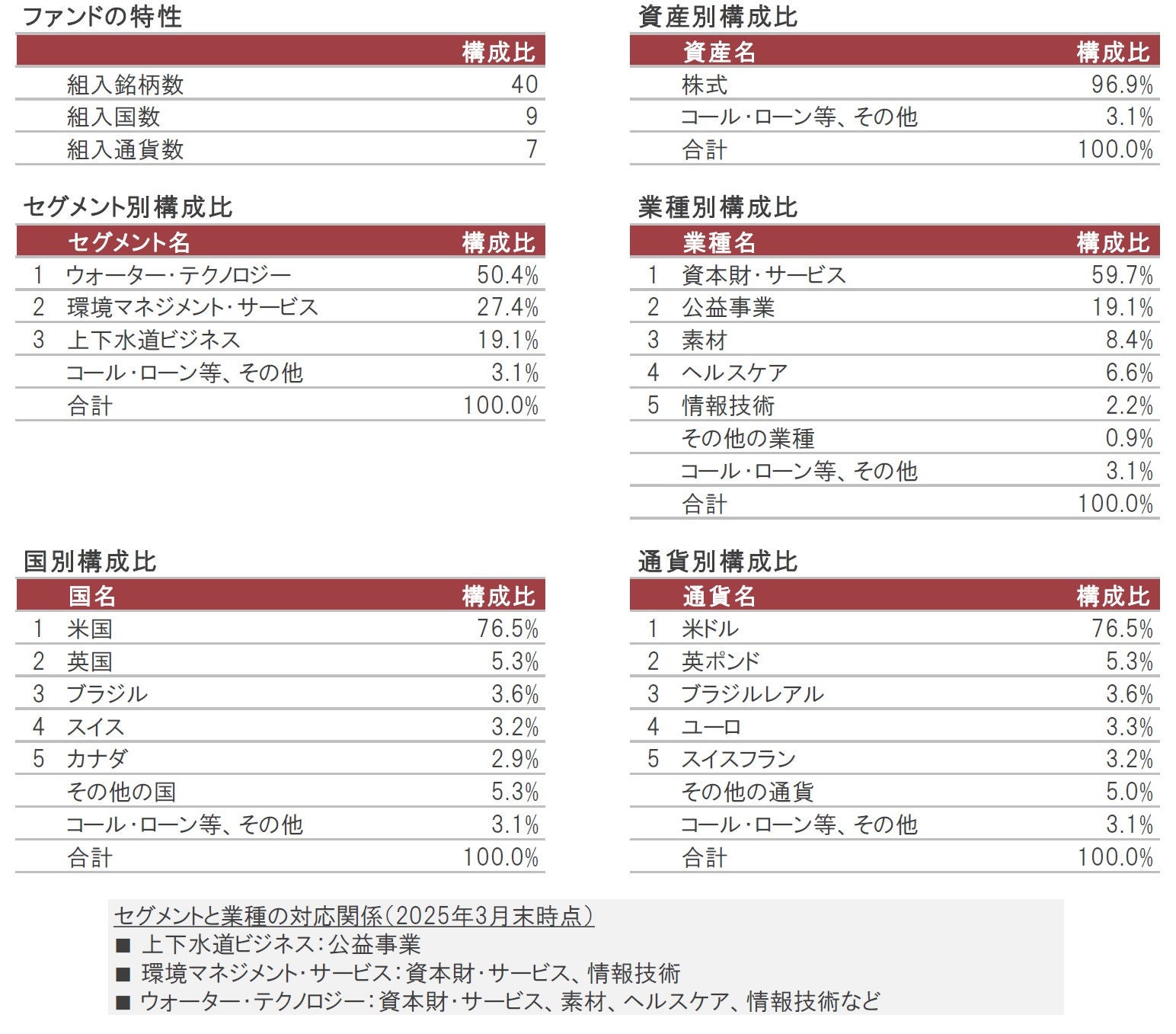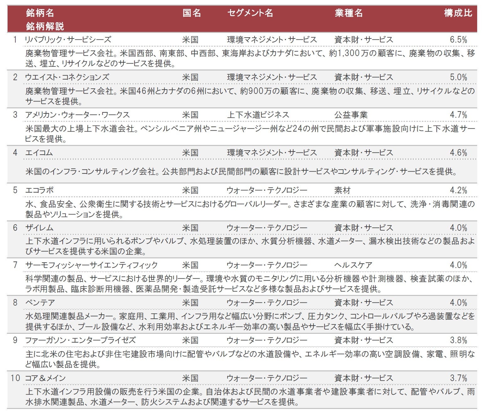 セグメント別構成比は、ウォーター・テクノロジーが50.4%、環境マネジメント・サービスが27.4%、上下水道ビジネスが19.1%となっています。業種別構成比は、資本財・サービスの比率が59.7%と過半を占めていますが、公益事業や素材、ヘルスケア、情報技術など、組入業種は多岐にわたります。