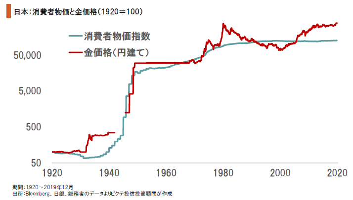 米国と同じく、円に対しても金はインフレヘッジの役割を果たしてきた。特に、戦後、戦時公債の処理で政府が預金封鎖、新円切り替え、そして財産税を課し、日本経済がハイパーインフレに苛まれるなか、金は物価にほぼ連動した動きを示している。この経験は、近現代経済においても、金がインフレに極めて強い資産であることを示したと言えそうだ。