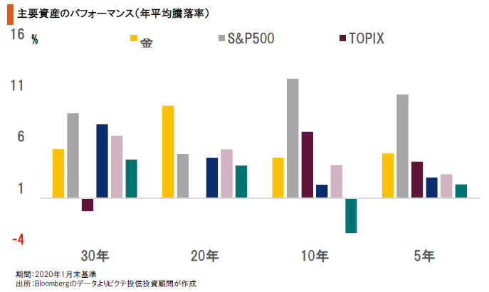 過去30年、20年、10年、5年で区切ると、金は常に最善と言うわけではないが、常に良好なパフォーマンスを示してきた。この間、世界的に物価は安定しており、インフレを懸念すべき状況ではない。それでも、金価格が過去最高値水準にあるのは、主要中央銀行が強力な量的緩和を実施してきた結果、市場が将来のインフレリスクを感じているからと考えられる。