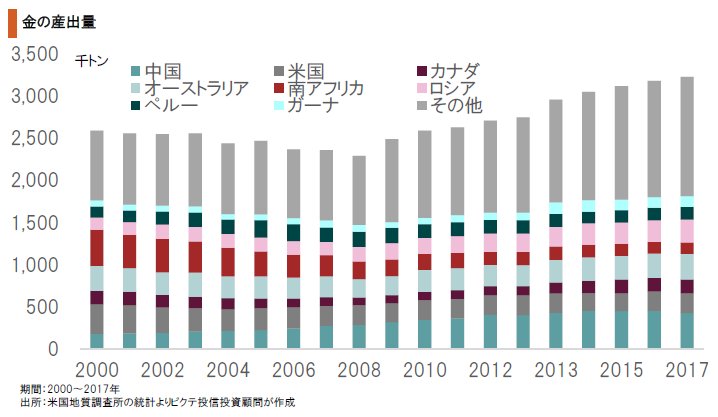 金の供給に関しては、このところ年3,300トン程度のペースで採掘が行われている。生産が伸びているのは中国であり、細っているのは南アフリカだ。金の埋蔵量については、確認、未確認を含めて3万トン程度と言われる。世界の名目GDPの成長ペースを考えた場合、その希少性は持続的に高まる可能性があるのではないか。