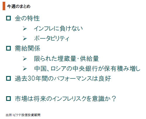 金は、インフレに強い資産であり、且つポータビリティの高いことが最大の特徴だ。需給関係を見ると、供給が限られる一方において、中国人民銀行が着実に保有を増やしている。利息や配当を生まない資産ではあるものの、将来のインフレリスクをヘッジする上で、ポートフォリオの一部に組み入れるのに適していると言えるのではないか。