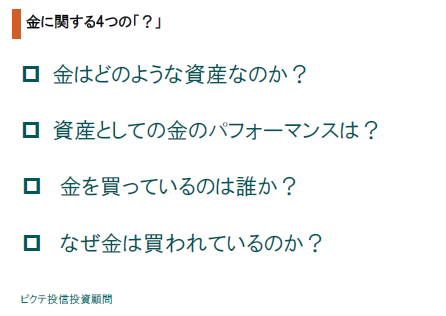 金は古代より権力の象徴であり、権力が独占的に発行する通貨として活用されてきた。その特徴は、希少性、美しさ、ポータビリティ、金属としての強さ、加工の容易性・・・などと言えよう。これらの特徴は、金に独自の地位を与え、現在も観賞用、装飾用のみならず、価値の貯蔵手段としての役割を担わせている。