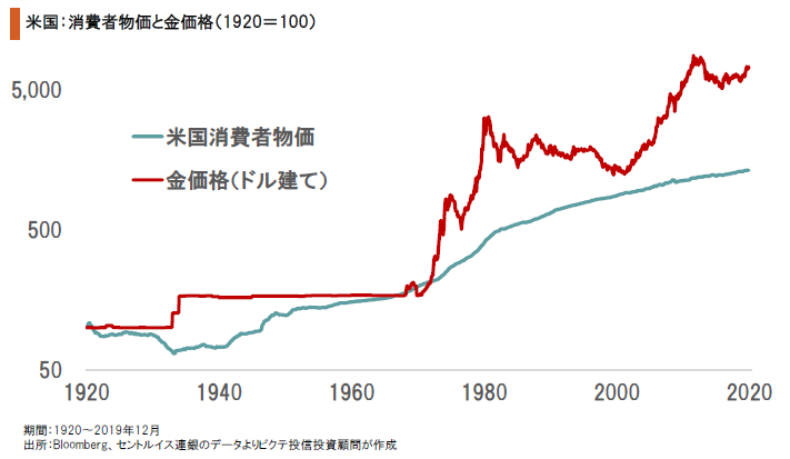 過去100年間で見ると、米国では、金の価格が消費者物価上昇率に勝ってきた。特に1971年8月15日の「ニクソン・ショック」で金とドルの兌換性が停止して以降、ドルの趨勢的な購買力低下(インフレ)に対し、金は物価上昇へのヘッジに適した資産だったと言える。