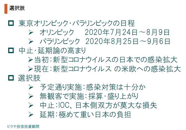 新型ウイルスにより予定通りの五輪の開催が難しい場合、考え得る選択肢は3つある。1つ目は無観客として予定通り開催だが、これは盛り上がりに欠ける上、入場料収入が入らなくなる。2つ目は完全に中止だ。これを選択した場合、IOCも日本側も莫大な損失を負うだろう。3つ目の延期は、日本のコスト負担が重く、且つ選手の選出方法など多くの課題を伴う。