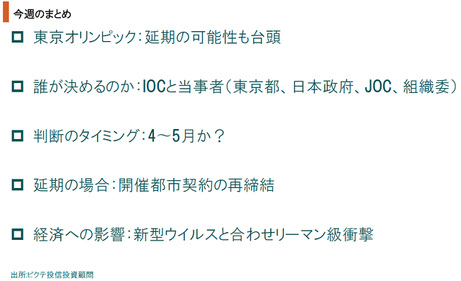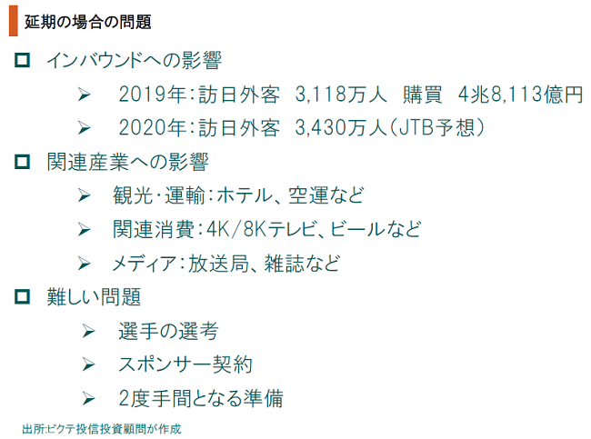 仮に五輪が延期になった場合、2020年に関しては、新型コロナウイルスとマイナスの相乗効果でインバウンド消費に影響を与えるだろう。加えて、五輪に向け設備投資など準備を進めてきたホテル、航空、4K/8Kテレビ、メディアなど、多方面への影響が懸念される。新型コロナウイルス問題を合わせれば、リーマンショック以上の落ち込みになる可能性は否定できない。