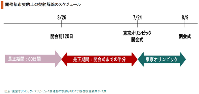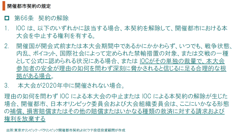 IOCと東京都などが締結した『開催都市契約』によれば、IOCは合理的理由があれば一方的に契約解除、即ち五輪の中止を決定でき、日本側に賠償請求権はない。ただし、IOCの被る損失も大きいため、中止の可能性は低いだろう。予定通りの開催が困難な場合、開催都市契約を再締結し、延期することが最もあり得るシナリオではないか。