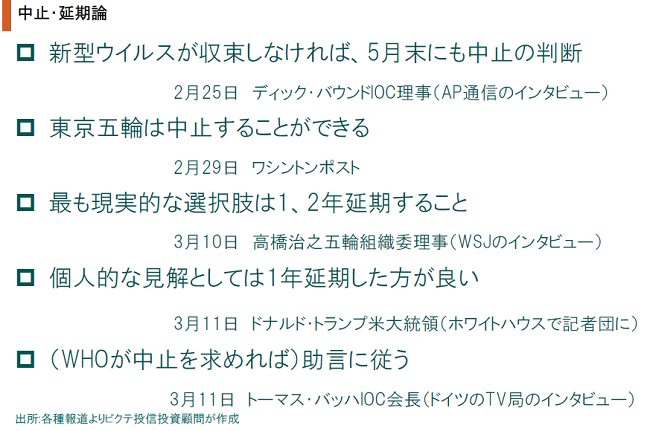 中止論に注目が集ったのは、2月25日、IOCのバウンド理事がAP通信のインタビューで可能性を語ったことが契機となった。当初、日本側が極めて否定的だったのは、新型ウイルスの抑制に失敗した日本の事情が中止論の背景だったからだ。しかし、むしろ米欧での感染拡大が深刻化するなか、日本政府内においても、様々なシナリオが検討されていると見られる。