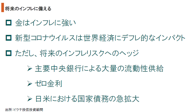 新型コロナウイルスによる世界的な経済失速は、当面、明らかにデフレ圧力である。そうしたなか、金が買われているのは、短期的な視点ではなく、長期的な観点から、インフレへのヘッジを意識したものではないか。主要中央銀行が大量の流動性を供給し、各国の財政赤字が急増していることから、通貨価値下落の可能性が強まっているからだ。